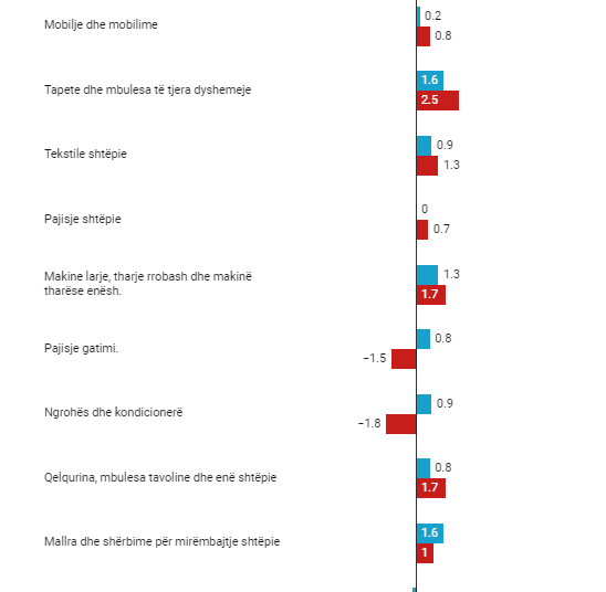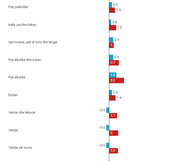 Më lirë se një vit më parë janë vetëm “Këpucët për burra” (-0.9%), “Pajisje gatimi” (-1.9%), “Blerje mjetesh transporti” (-2.3%), “Ngrohës dhe kondicionerë” (-1.8%).