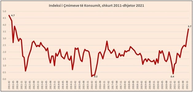 Dhe jo vetëm karburantet. Në muajt e fundit të vitit 2021 dhe fillim të 2022, familjet shqiptare pothuajse çdo produkt po e blejnë më shtrenjtë. Në dhjetor, inflacioni, që mat ndryshimin e çmimeve të një shporte bazë mallrash, arriti në nivelin më të lartë të dekadës prej 3.7%, që do të thotë që çmimet e produkteve që konsumon një familje në një muaj janë mesatarisht 3.7% më shtrenjtë.