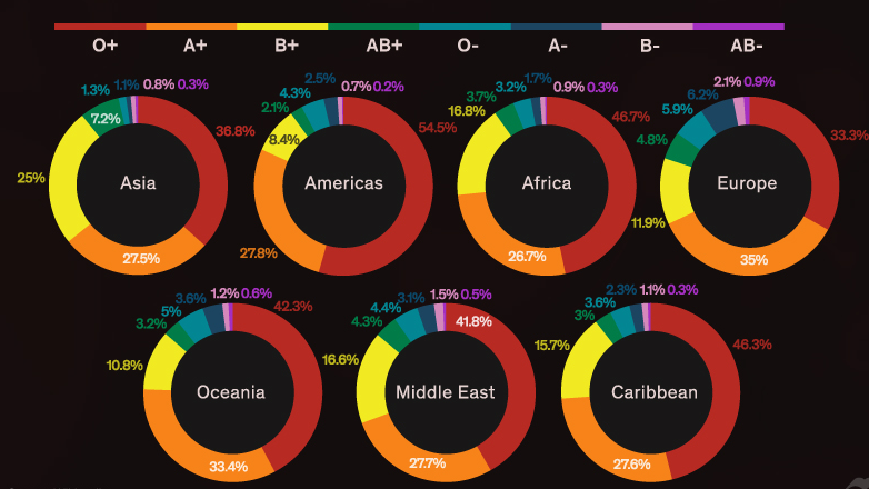 Visualcapitalist ka zbuluar se grupi më i zakonshëm i gjakut në 7,9 miliardë njerëz, të shpërndarë në 195 vende dhe 7 kontinente është ai 0+ me 39 për qind të popullsisë së botës. Më i rralli ndërkohë është grupi i gjakut AB- me vetëm 0.40% të popullsisë së botës.
