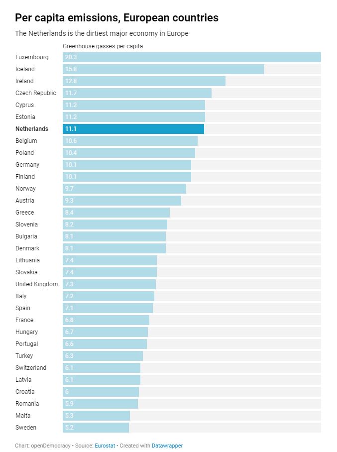 Miqtë në lëvizjet klimatike, jashtë Holandës, shpesh supozojnë se vendi duhet të jetë mirë kur bëhet fjalë për mjedisin. Por Holanda renditet në tre vendet e fundit për prodhimin e energjisë së rinovueshme në Evropë. Ajo reduktoi emetimet e saj të CO2 me 7% midis 2009 dhe 2019, krahasuar me një mesatare të BE-së prej 10%, dhe MB e Danimarka me 23% dhe 25% respektivisht. Ajo mban numrin më të madh të bagëtive për km katror nga çdo vend në botë.