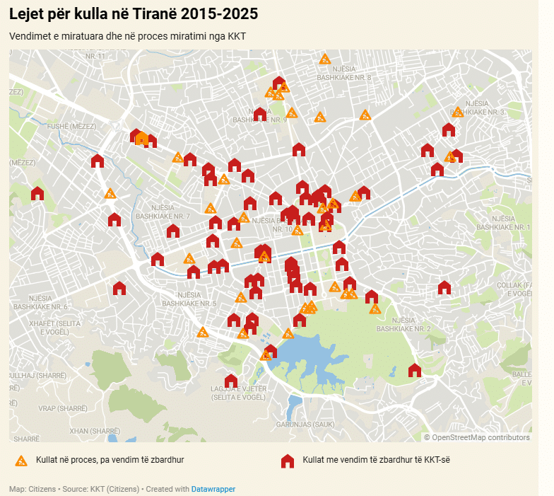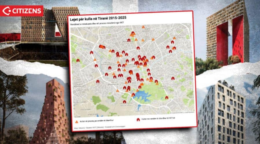 Duke analizuar të dhënat e lejeve të publikuara në 15 vitet e fundit, Citizens.al ka krijuar një hartë të vendodhjes së kullave në kryeqytet. Të dhënat tregojnë një rritje progresive e lartësisë dhe intensiteit të ndërtimeve.