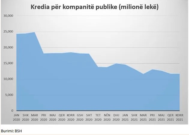 Të dhënat e Bankës së Shqipërisë tregojnë se në fund të muajit korrik, portofoli i huasë së kompanive publike kishte vlerën e 11.9 miliardë lekëve, në tkurrje me 20% krahasuar me fillimin e vitit dhe me 36% krahasuar me të njëjtën periudhë të një viti më parë.