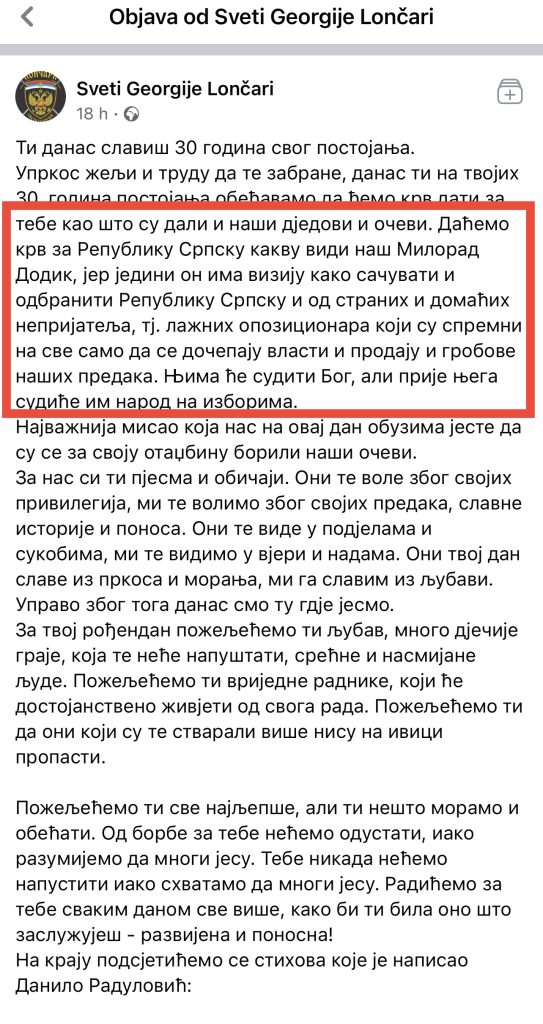 “Ne do të japim gjak për Republikën Srpska siç e sheh Milorad Dodiku ynë, sepse vetëm ai ka një vizion se si ta ruajë dhe mbrojë Republikën Srpska nga armiqtë e jashtëm dhe të brendshëm, d.m.th. opozitarë fallco që janë gati për çdo gjë, vetëm për të kapur pushtetin dhe për të shitur varret e të parëve tanë. Ata do të gjykohen nga Zoti, por para tij do t’i gjykojë populli në zgjedhje”, kanë shkruar anëtarët e Shoqatës së Shën Gjergjit nga Lonçari, fshat që i përket rrethit të Bërçkos, me rastin e ditës antikushtetuese të Republikës Srpska.