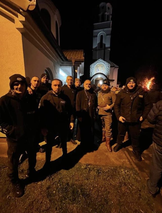 Fotoja që shihni është bërë katër ditë më parë, kur humanitarët po bëheshin gati për të festuar Krishtlindjet. Pema e Krishtlindjes është ndezur para kishës në Lonçar. Atyre iu bashkuan edhe çetnikët, po ashtu me uniformë me shenja në kapele.