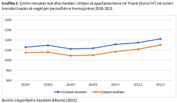 Në Grafikun 3, paraqitet çmimi mesatar real dhe median i shitjes së apartamenteve në Tiranë (Euro/m2) në zonën brenda Unazës së vogël për periudhën e tremujorëve 2020-2021. Siç mund të vihet re nga grafiku, çmimi mesatar real i shitjes në këtë zonë, ka ardhur duke u rritur, në intervalin 1,128 – 1,212 €/m2. Çmimet mediane luhaten në intervalet 1,074 – 1,152€/m2.