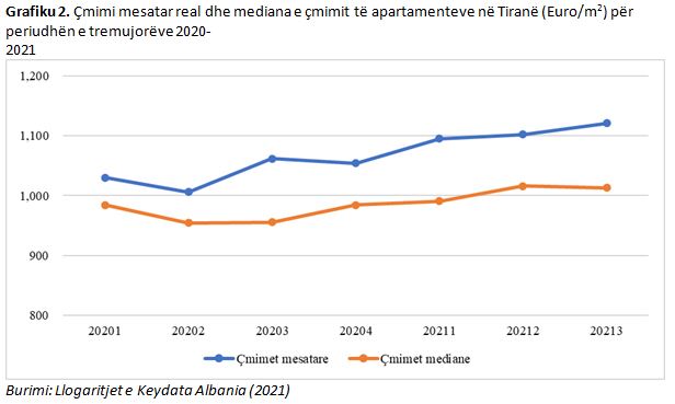 Në Grafikun 2 paraqitet çmimi mesatar real i shitjes së apartamenteve në Tiranë në Euro/m2 për periudhën e tremujorëve 2020-2021, shprehur në vlerë reale (i deflatuar me normën e inflacionit) si dhe çmimet mediane (vlera e mesit). Nga tremujori i parë 2021 deri në tremujorin e tretë 2021, niveli i çmimeve mesatare reale në Tiranë ka lëvizur brenda intervalit 1,030 €/m2 – 1,121 €/m2, ndërsa çmimet mediane brenda intervalit 984 në 1,013 €/m2.