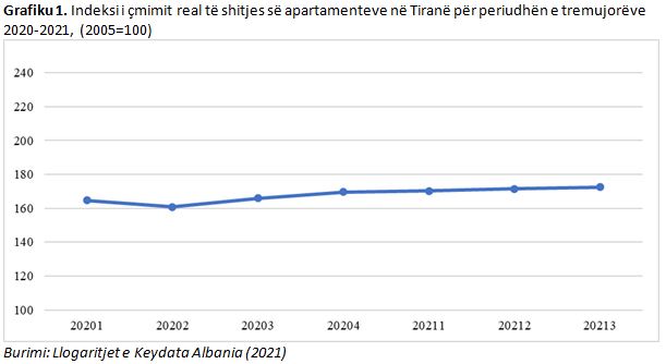 Sipas raportit në Grafikun 1 është paraqitur kurba e evoluimit në kohë të indeksit të çmimit real të shitjes së apartamenteve në Tiranë për periudhën e tremujorëve 2020-2021. Si bazë krahasuese për të gjitha periudhat e përfshira në vlerësim, ekspertët e Keydata kanë përcaktuar vitin 2005 si një periudhë që plotëson kriteret dhe kushtet e një momenti të qëndrueshëm për tregun e pronave të paluajtshme. Vlera e indeksit për vitin 2005 është caktuar 100.