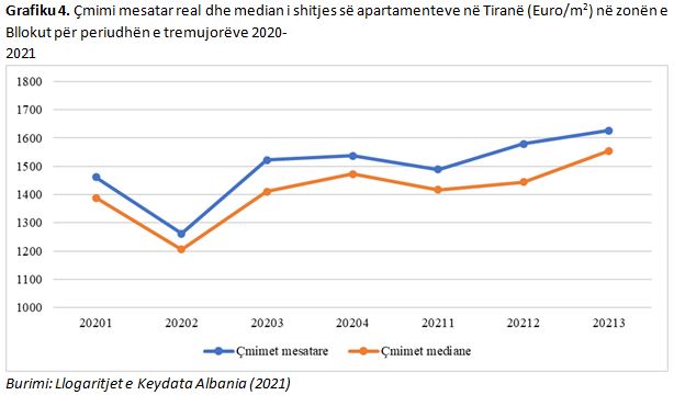 Një rënie e nivelit të çmimeve mesatare reale vihet re në tremujorin e dytë 2020, 13.7%, shoqëruar më pas me një rritje me të madhe me 20.7% krahasuar me një tremujor më parë, një rënie me 3.2 % nga tremujori i katërt 2020 në tremujorin e parë 2021 shoqëruar më pas me një rritje me 6.2% dhe sërisht një rënie me 2.9% nga tremujori i dytë në tremujorin e tretë 2021. Përsa i përket periudhës aktuale, në këtë tremujor të tretë 2021, mesatarisht një apartament në zonën e bllokut shitet në vlerën 1,626 €/m2, çmimi median përllogaritet në vlerën 1,554 €/m2. Çmimet mesatare në këtë tremujor krahasuar me tremujorin e dytë 2021 janë rritur me 2.9% ndërsa çmimet mediane janë rritur me 7.66%.