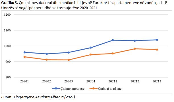 Në Grafikun 5 paraqitet evoluimi i çmimit mesatar real dhe median të shitjes në Euro/m2 të apartamenteve në zonën jashtë Unazës së vogël. Çmimet mesatare reale në këtë zonë variojnë nga një interval 959 €/m2 deri në 1,036 €/m2 në tremujorin e parë 2021. Çmimet mediane variojnë në intervalin nga 930 €/m2 – 951 €/m2.