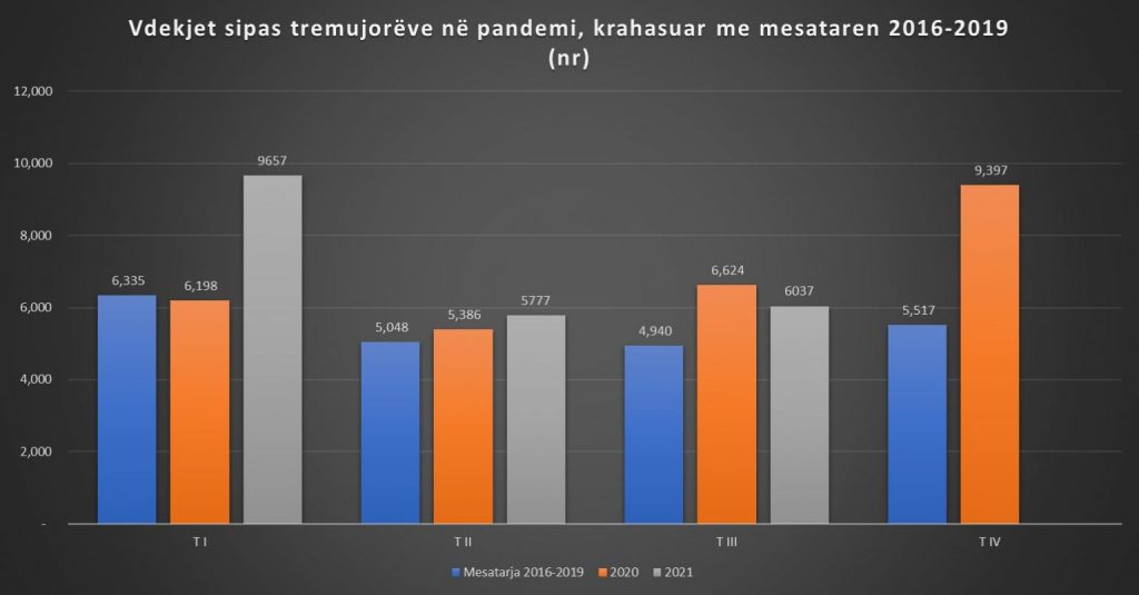 Në krahasim me mesataren e 9 mujorit 2016-2019, fatalitetet në vend për janar-shtator 2021 janë rritur ndjeshëm me 31.6% (shiko grafikun: Vdekjet, 9 mujori).