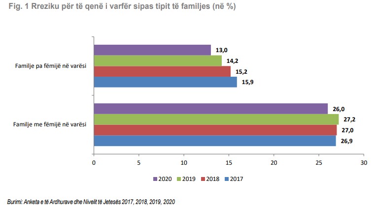 Përqindja e individëve në rrezik për të qenë të varfër sipas tipit të familjes, në vitin 2020, në familjet pa fëmijë në varësi, vlerësohet të jetë më e ulët, krahasuar me familjet me fëmijë në varësi, përkatësisht 13,0% dhe 26,0 % e individëve. Një vit më parë këto përqindje ishin përkatësisht 14,2% dhe 27,2%.