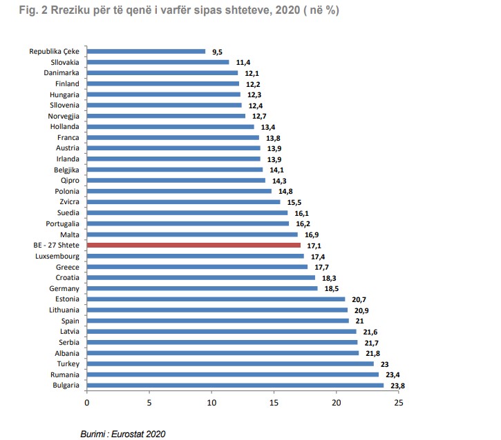 Në krahasim me rajonin, Shqipëria ka treguesin më të lartë për të rrezikut për të qenë të varfër, ndërsa në Europë lë pas tre shtete, Turqinë, Rumaninë he Bullgarinë.