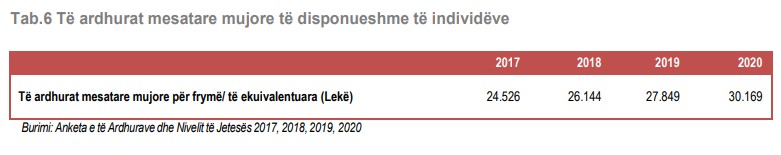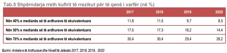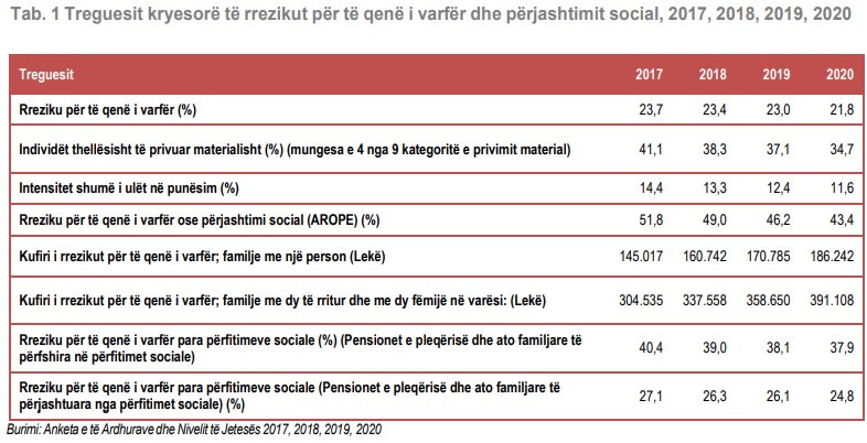 INSTAT bëri të ditur se në vitin 2020 janë vlerësuar 621.504 individë që jetojnë nën kufirin e rrezikut për të qenë të varfër, kundrejt 659.138 individë të vlerësuar në vitin 2019. Kjo tregon se niveli i përgjithshëm i të ardhurave familjare të disponueshme është rritur dhe numri i individëve në rrezik për të qenë të varfër është ulur me rreth 5.7%.