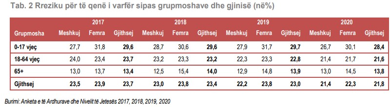 Rreziku për të qenë i varfër sipas grupmoshave dhe gjinisë është analizuar për tre grupmosha. Trendi në rënie vihet re në të tre grupmoshat, por një rënie më të madhe kanë grupmoshat 0-17 vjeç dhe 18-64 vjeç, ku rreziku për të qenë i varfër në vitin 2020, në krahasim me vitin 2019, është ulur respektivisht me 1,3 dhe 1,2 pikë përqindje. Grupmosha 65 vjeç e lart ka pësuar një ulje me 0,1 pikë përqindje, krahasuar me 2019.