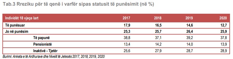 Rreziku për të qenë i varfër sipas statusit të punësimit, për të punësuarit e moshës 18 vjeç e lart, në vitin 2020 ka pësuar rënie me 1,9 pikë përqindje, krahasuar me vitin 2019. Rreziku për të qenë i varfër tek individët e papunë ka pësuar një rënie prej 1,4 pikë përqindje, ndërsa tek pensionistët ka pësuar një rënie prej 0,1 pikë përqindje.