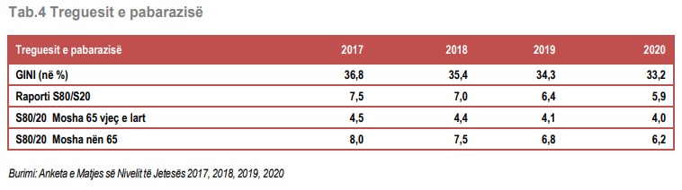 Koefiçenti Gini mat pabarazinë në shpërndarjen e të ardhurave, ku vlera 0 % shpreh barazinë e plotë dhe të gjithë individët kanë të ardhura të njëjta, ndërsa një koeficient Gini i barabartë me 100 % shpreh pabarazinë e plotë ku vetëm një person ka të gjitha të ardhurat. Në vitin 2020, Gini është vlerësuar 33,2 %, duke pësuar rënie me 1,1 pikë përqindje nga viti 2019.