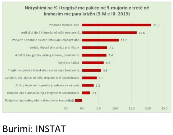 Pas produkteve farmaceutike, me rritjen më të lartë të shitjeve rezultojnë artikujt industriale në njësi të specializuara tregtare, që përfaqësojnë kryesisht materialet të ndërtimit. Shitjet në këto produkte u rriten me 16% në krahasim me 3-mujorin e tretë 2019, ndërsa në raport me vitin 2020 ato u rriten vetëm me 0.8%.