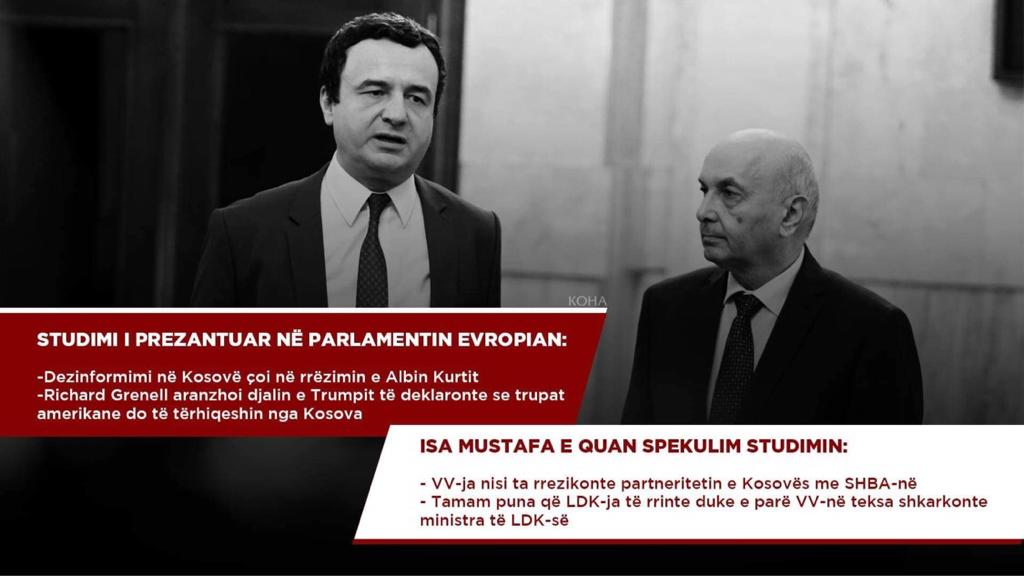 Kryetari i Lidhjes Demokratike të Kosovës, Isa Mustafa e ka quajtur si “manipulim” studimin e bërë për nevojat e Komitetit të Politikës së Jashtme të Parlamentit Evropian (AFET) në të cilin thuhet se qeveria e Albin Kurti është rrezuar “nga një operacioni dezinformues amerikan”.