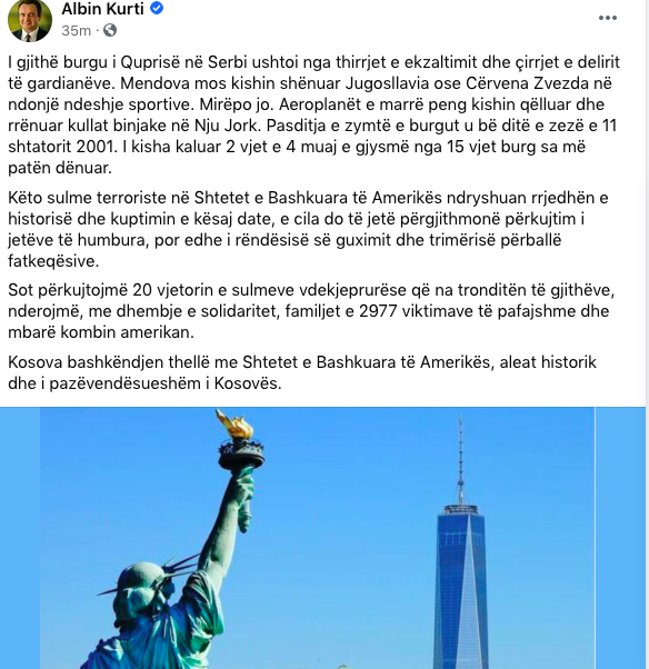 “Sot përkujtojmë 20 vjetorin e sulmeve vdekjeprurëse që na tronditën të gjithëve, nderojmë, me dhembje e solidaritet, familjet e 2977 viktimave të pafajshme dhe mbarë kombin amerikan. Kosova bashkëndjen thellë me Shtetet e Bashkuara të Amerikës, aleat historik dhe i pazëvendësueshëm i Kosovës”, shprehet Kurti.