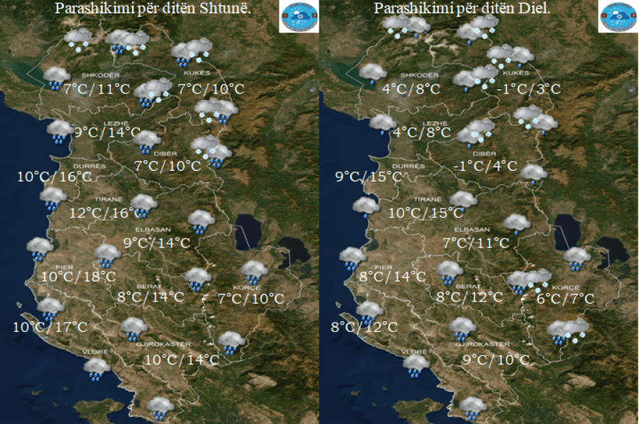 Në zonën e veriut në lartësitë mbi 300 metër reshje dëbore ndërsa në zonën e juglindjes në lartësitë mbi 1000 metër reshje dëbore.