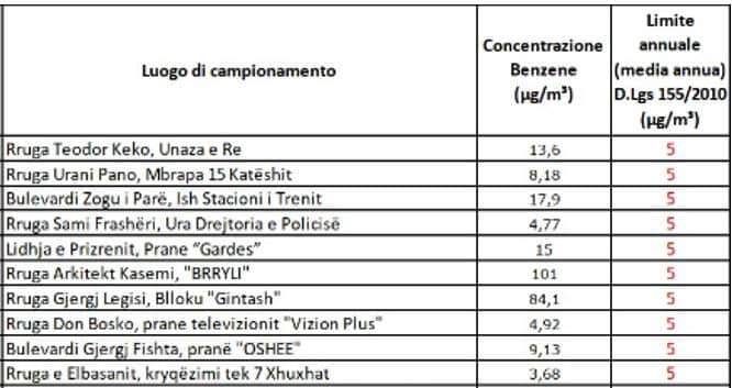 Kështu, mesatarja e prezencës së benzenit në Tiranë është 21.3 mikro gramë nga 5 mikrogramë që është në Itali shpjegojnë specialistët nga ky vend. Madje ka edhe zona ku ajo arrin në shifra alarmante në 101 mikrogramë për metër kub. Shiko tabelën më poshtë me matjet në të 20 pikat.