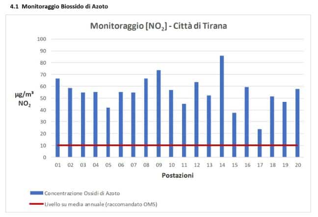 Po ashtu në përmasa alarmante është edhe përqëndrimi i dioksidit të azotit. Në tabelën e mëposhtme të hartuar për “Piranjat” nga laboratori italian ‘Neotes”, shihet se ka pika ku ai arrin në shifra 9-fish më të larta sesa mesatarja e rekomanduar nga Organizata Botërore e Shëndetësisë.