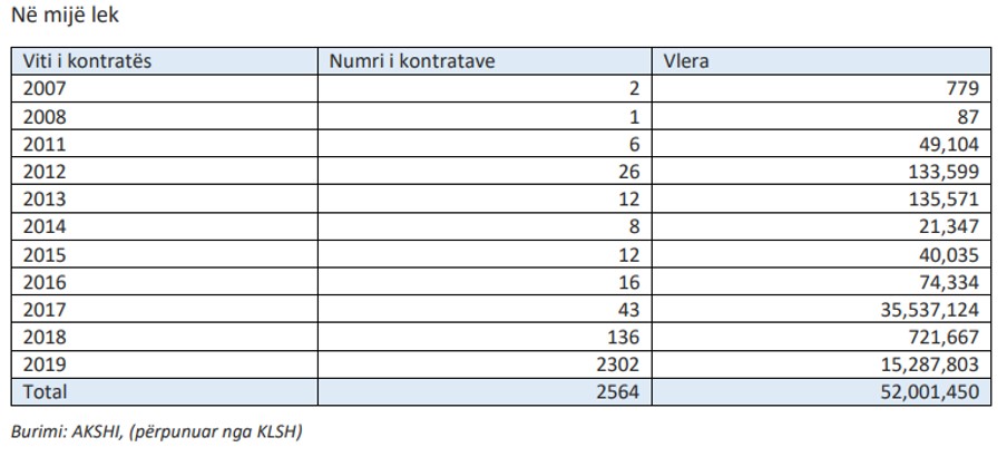 “Gjatë vitit 2020 janë regjistruar 2564 kontrata në vlerën totale 52 miliardë lekë të cilat u përkasin viteve të mëparshme. Kontrata më e hershme e regjistruar në vitin 2020, rezulton të jetë lidhur në vitin 2007, pra 13 vite më parë”, raportoi KLSH.