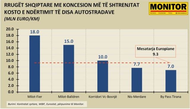 Sipas të dhënave të Eurostat, mesatarja europiane për koston e ndërtimit të një autostrade është 9.3 milionë euro/km.