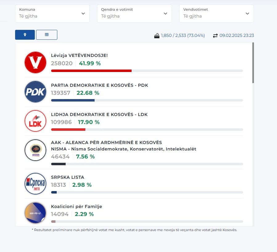 Janë numëruar 73.04% për qind të votave dhe LVV është 41.99 për qind, PDK-22.68 për qind derisa LDK – 17.90 për qind të votave.