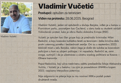 Sipas KRIK, Vuçetiq është parë më 28 qershor 2025 në kampin “Cacilend”, në ditën e protestës studentore të Vidovdanit. Ndaj tij ekziston urdhër arresti ndërkombëtar për terrorizëm lëshuar përmes Interpolit, por ai lëviz lirisht në Beograd nën mbrojtjen e pushtetit.
