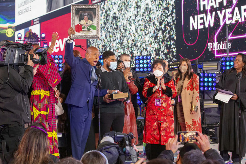 Disa minuta pasi mesnatës dhe që u lëshua topi i kristaltë, Eric Adams mbante me njërën dorë fotografinë e të ëmës Dorothy dhe tjetrën e vuri mbi Bibël duke u betuar.