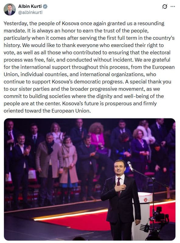 “Dje, qytetarët e Kosovës na dhanë edhe një herë një mandat të fuqishëm. Është gjithmonë nder të fitosh besimin e popullit, veçanërisht kur ai vjen pas përfundimit të mandatit të parë të plotë në historinë e vendit. Dëshirojmë të falënderojmë të gjithë ata që ushtruan të drejtën e tyre për të votuar, si dhe të gjithë ata që kontribuuan që procesi zgjedhor të ishte i lirë, i drejtë dhe të zhvillohej pa incidente. Jemi mirënjohës për mbështetjen ndërkombëtare gjatë gjithë këtij procesi, nga Bashkimi Evropian, vendet individuale dhe organizatat ndërkombëtare, të cilat vazhdojnë të mbështesin përparimin demokratik të Kosovës. Një falënderim i veçantë për partitë tona motra dhe për lëvizjen më të gjerë progresive, teksa angazhohemi për ndërtimin e shoqërive ku dinjiteti dhe mirëqenia e njerëzve janë në qendër. E ardhmja e Kosovës është e begatë dhe e orientuar fuqishëm drejt Bashkimit Evropian”, ka shkruar ai në X.