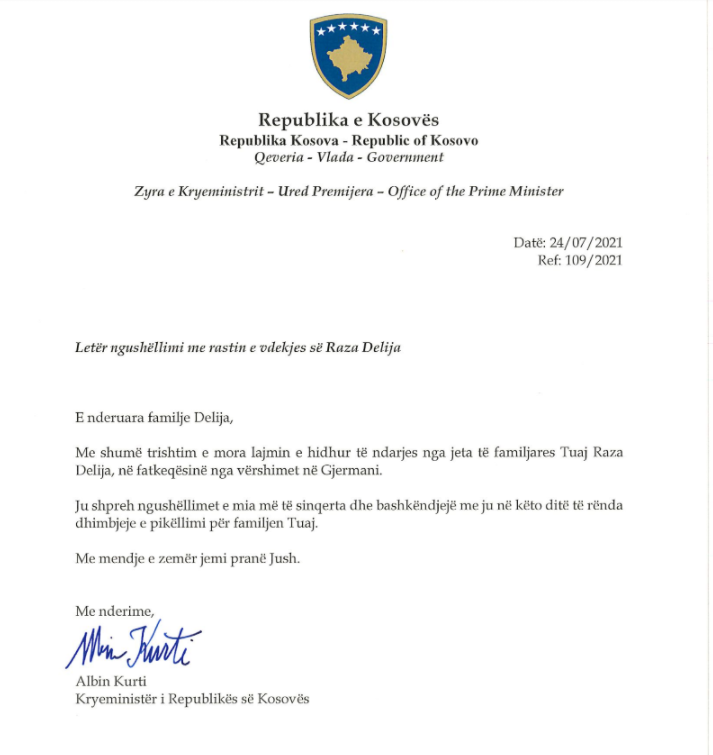 Në letrën e ngushëllimit, e cila i është dërguar familjes Delija në fshatin Zahaq të Pejës, kryeministri Kurti ua ka shprehur atyre ngushëllimet më të sinqerta për humbjen e dy familjarëve në fatkeqësinë natyrore që goditi Gjermaninë.