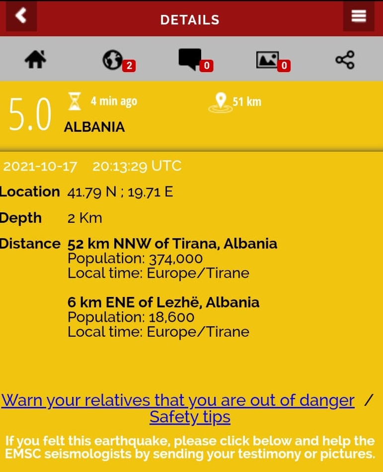 Lajme LAJM I FUNDIT/ Lëkundje tërmeti në Shqipëri October 17, 2021 user 1 Lëkundje tërmeti u ndjenë para pak çastesh në Tiranë dhe në disa qytete të veriut të vendit. Epiqendra ka qenë në afërsi të Lezhës me magnitudë 5 të shkallës Rihter. Lexo më shumë Sëmundjet e zemrës dominojnë strukturën e vdekjeve në Shqipëri shumë më tepër se në vendet e Bashkimit Evropian Nuk raportohet për të lënduar. Rruga Press