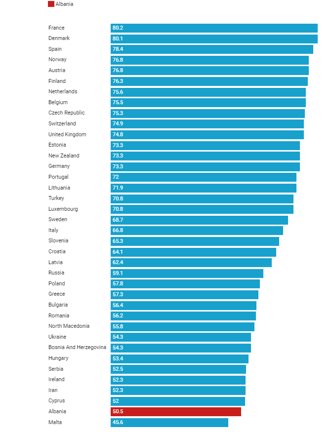 Në rajon Shqipëria u rendit e fundit si për indeksin e shërbimeve dhe atë të shpenzimeve buxhetore krahasuar me Serbinë, Maqedoninë e Veriut dhe Bosnjën (shiko Grafikun bashkëngjitur), Kosova dhe Mali i Zi nuk ishin të përfshira në këtë indeks.