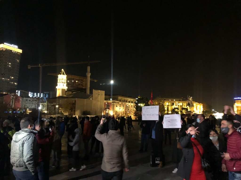 Efektivët iu kanë kërkuar qytetarëve të largohen për shkak të kushteve të pandemisë COVID19. Ndërkohë që të rinjtë nën thirrjet “drejtësi për Klodianin” dhe “Turp, hiqni kapelet”, kërkojnë që policët të heqin kapelet.
