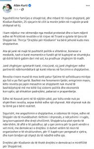 Kreu i Vetëvendosjes, Albin Kurti ka reaguar pas 7 ditësh për vrasjen e Klodian Rashës nga efektivi i policisë.