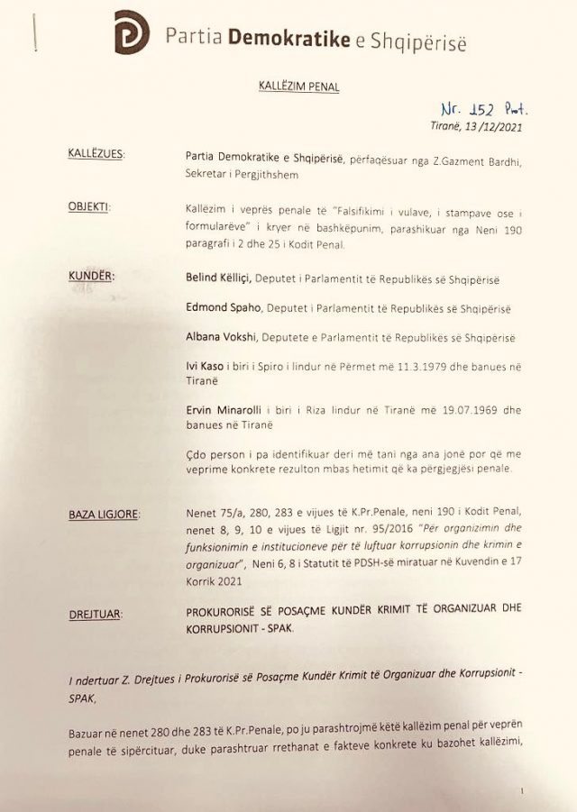 Konkretisht Lulzim Basha ka kallëzuar në SPAK për falsifikimin e vulës së PD, deputetët Belind Këlliçi, Edmond Spaho, Albana Vokshi, si dhe Ivi Kaso e Ervin Minarolli.