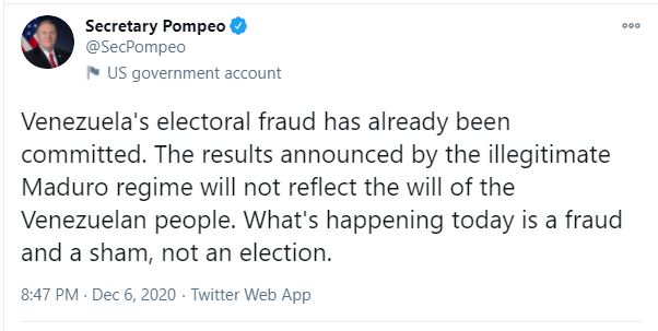 Sekretari Amerikan i Shtetit Mike Pompeo reagon pas zgjedhjeve në Venezuelë.