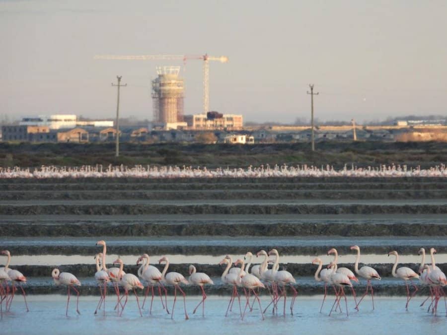 Tufa flamingosh në lagunën e Nartës, teksa në sfond vijon punimet Aeroporti i Vlorës | Foto Joni Vorpsi PPNEA