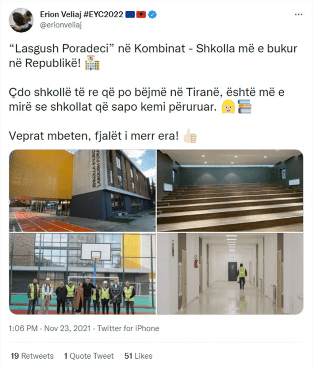 Paraqitjen në median sociale, Veliaj e shoqëroi me tekstin: “Lasgush Poradeci” në Kombinat – Shkolla më e bukur në Republikë! Çdo shkollë të re që po bëjmë në Tiranë, është më e mirë se shkollat që sapo kemi përuruar”.