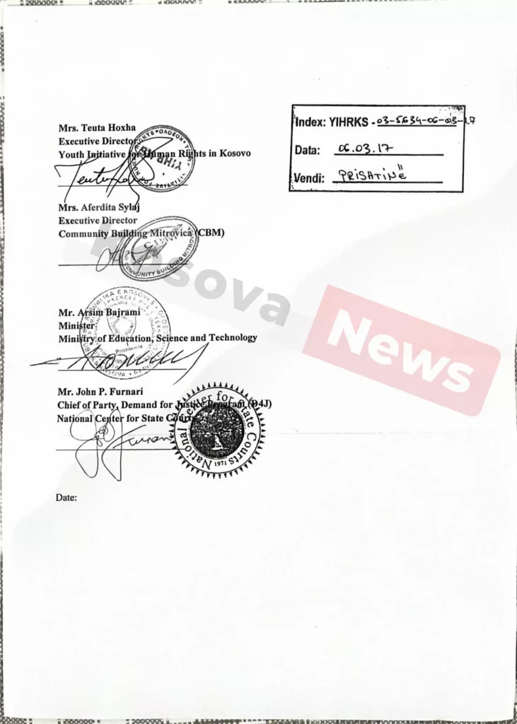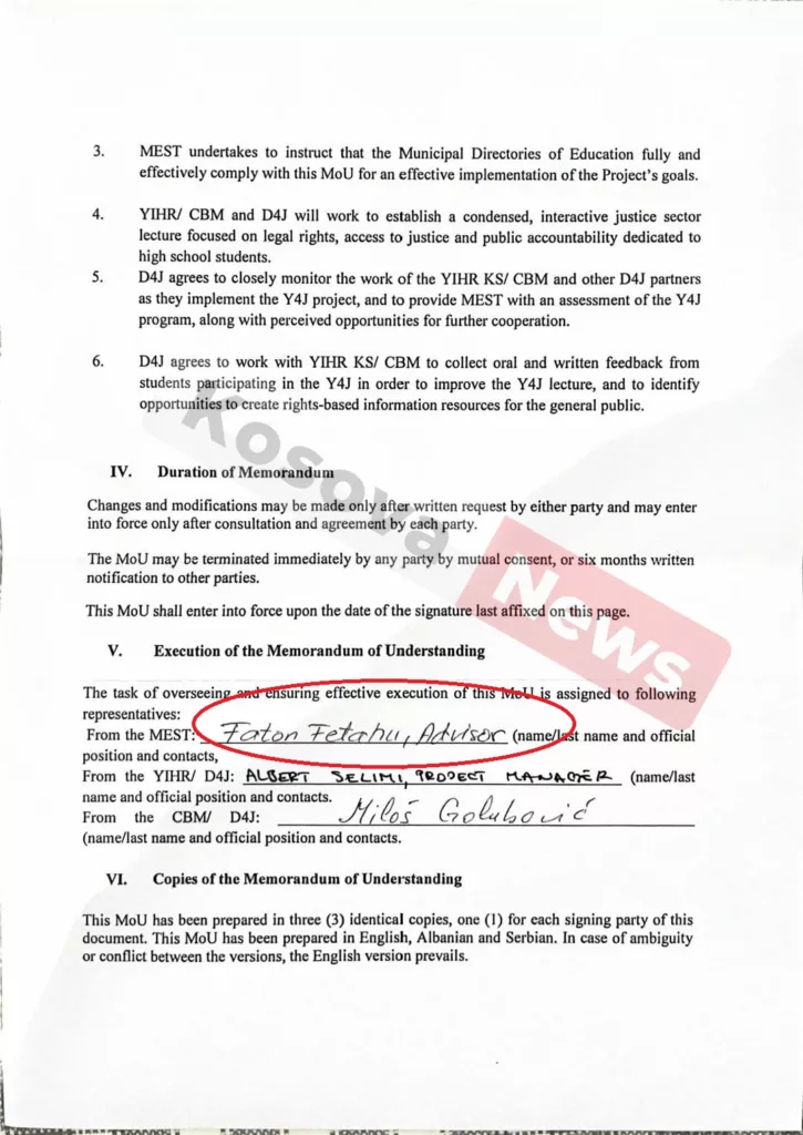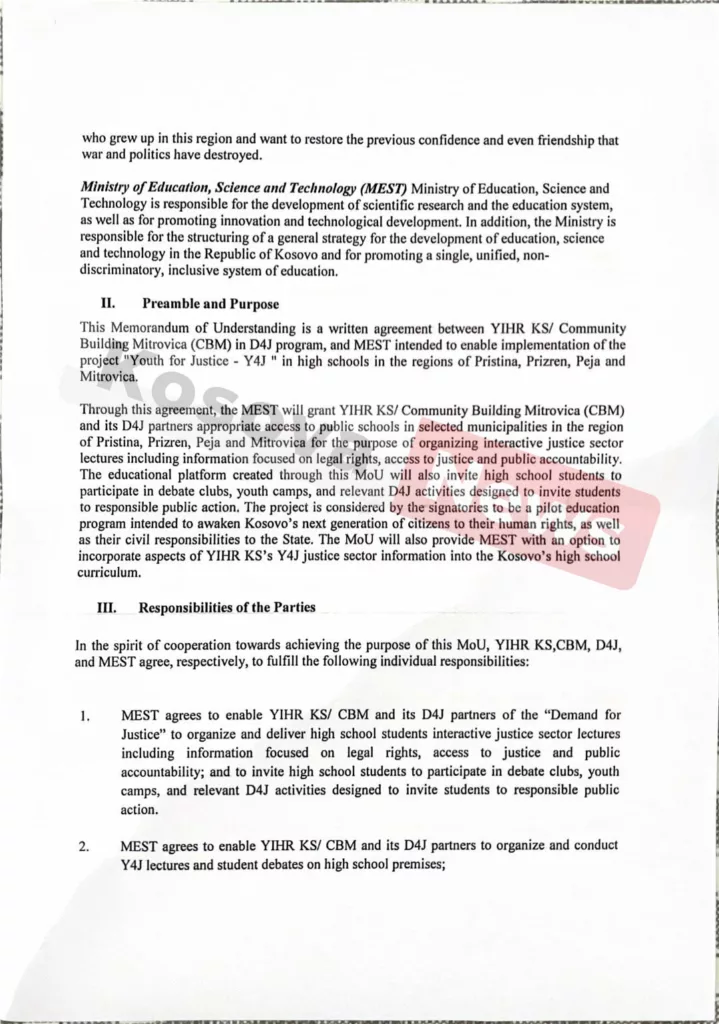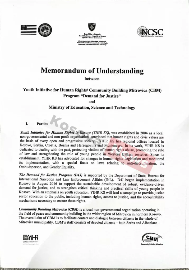 KosovaNews ka siguruar një dokument ekskluziv të memorandumit të bashkëpunimit ndërmjet Ministrisë së Arsimit Shkencës dhe Tenologjisë dhe Nisma e të Rinjve për të Drejtat e Njeriut në Kosovë (YIHR).