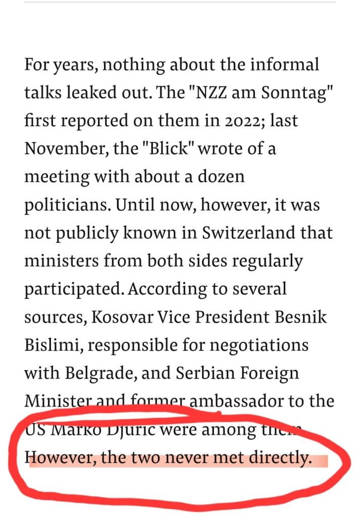 Gazeta zvicerane Neue Zürcher Zeitung (NZZ) ka bërë një sqarim në artikullin e saj lidhur me takimet e zhvilluara në Zvicër mes përfaqësuesve të Kosovës dhe Serbisë, duke theksuar se zëvendëskryeministri i Kosovës, Besnik Bislimi, dhe ministri i Jashtëm i Serbisë, Marko Gjuriq, nuk janë takuar as fshehurazi, as zyrtarisht, as drejtpërdrejt.