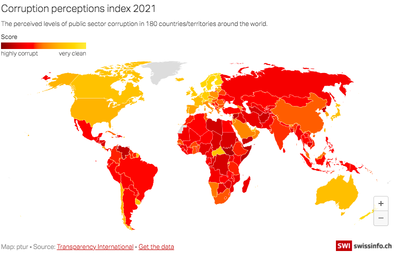 Shteti alpin performoi mirë në përgjithësi në Indeksin e Perceptimit të Korrupsionit të OJQ-së për vitin 2021 – megjithëse ra nga vendi i tretë në të shtatë duke shënuar një pikë më pak se në vitin 2020. “Në luftën kundër korrupsionit në sektorin publik, Zvicra është edhe një herë larg të qenit pa të meta dhe madje është duke u tejkaluar nga vendet e tjera”, thotë Martin Hilti, drejtor i Transparency International Zvicer.