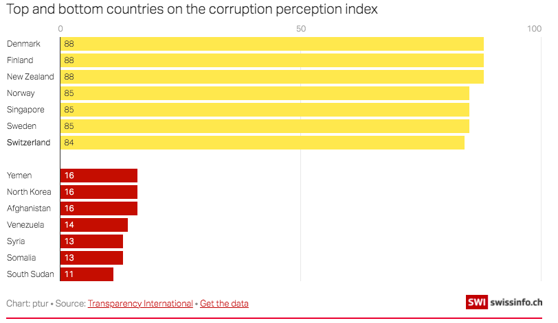Kombet e shkatërruara nga konflikti, Sudani i Jugut, Siria dhe Somalia morën pikët e fundit. Transparency International arrin në përfundimin se kontrolli i korrupsionit ka ngecur ose është përkeqësuar në 86% të vendeve në dekadën e fundit. Ai vë në dukje se 27 vende – përfshirë Zvicrën – morën pikët më të ulëta që kishin arritur që nga viti më i hershëm i krahasueshëm i të dhënave të disponueshme (2012).