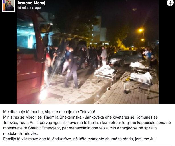 “Me dhembje të madhe, shpirt e mendje me Tetovën! Ministres së Mbrojtjes, Radmila Shekerinska – Jankovska dhe kryetares së Komunës së Tetovës, Teuta Arifit, përveç ngushëllimeve më të thella, i kam ofruar të gjitha kapacitetet tona në mbështetje të Shtabit Emergjent, për menaxhimin dhe tejkalimin e tragjedisë në spitalin modular të Tetovës.