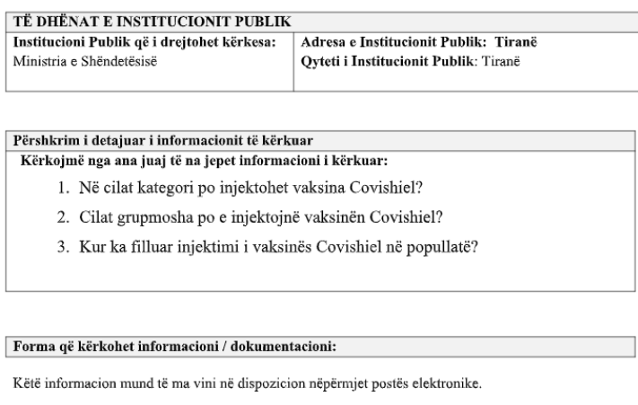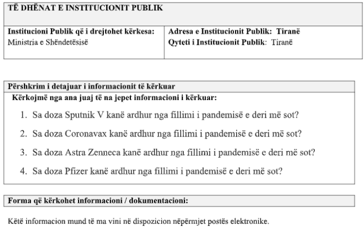 Kërkesa për informacion i ishte dërguar këtij institucioni në kuadër të një shkrimi (botuar më 26 gusht) ku Faktoje raportoi se qeveria zbardhi më në fund kontratën për blerjen e kontigjentit të vaksinës Coronavac dhe atë Sputnik V, duke lënë ende pa transparencë blerjen e vaksinave Pfizer BionTech. Ndaj Faktoje kishte kërkuar nga Ministria e Shëndetësisë numrin e dozave të vaksinave të mbërritura, të ndara sipas kompanive prodhuese.