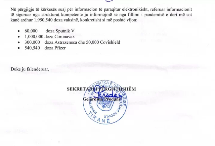 Ministria e Shëndetësisë, në përgjigjen e kthyer në 7 shtator konfirmon se nga nisja e vaksinimit deri në atë datë, kanë ardhur 1.950.540 doza vaksinë.