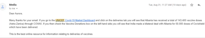 “Nëse shkoni në Panelin e Tregut të UNICEF Covid-19 dhe klikoni në skedën e dërgesave, do të shihni që Shqipëria ka marrë gjithsej 143.400 doza vaksinë (Astra Zenneca) përmes Covax. Nëse kontrolloni kutinë e Donacioneve të Vaksinave në anën e majtë do të shihni që India ka bërë një marrëveshje dypalëshe me Shqipërinë për 50.000 doza Covishield të cilat janë dorëzuar.”