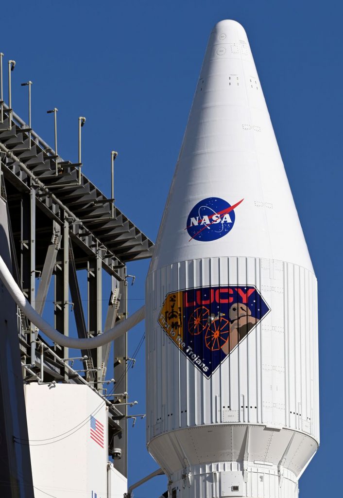 Kapsula me anijen Lucy të NASA-s, në majë të raketës United Launch Alliance Atlas 5, për një mision për të studiuar asteroidët trojan në sistemin e jashtëm diellor, qëndron në Pad-41 në përgatitje për nisje në Stacionin e Forcës Hapësinore Cape Canaveral në Cape Canaveral, Florida, SHBA 15 tetor 2021. REUTERS/Steve Nesius